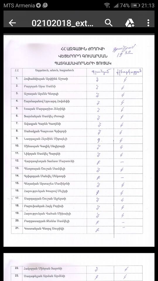 «Ելքի» պատգամավորները կանգնած էին, չէին էլ նստել իրենց տեղերում ու չէին գրանցվել: Սասուն Միքայելյանը բարկացած գոռում էր. «Քեզ ճնշում չկա, ժողովրդի կամքն ա, ճնշո՞ւմ են հիմա գործադրում: Մի ամբողջ բիբլիական ազգ ուզում եք ճնշել, դո՛ւք եք ճնշում գործադրում: Հերի՛ք եղավ, դո՛ւք եք ժողովրդին ճնշում, էսքան մարդու կրակի մեջ գցիք, երեխեք ունեն, ի՞նչ ձեւեր եք տալիս»: