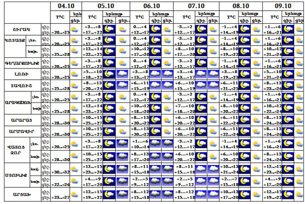 Հոկտեմբերի 4-ի ցերեկը, 7-9-ը սպասվում է առանց տեղումների եղանակ։ Հոկտեմբերի 5-6-ը Վայոց ձորում, Սյունիքում և Արցախում սպասվում է անձրև: