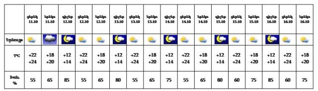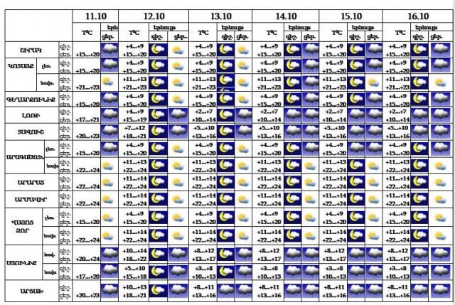 Հոկտեմբերի 11-ի ցերեկը, 14-16-ը առանձին շրջաններում, 12-13-ը՝ Լոռիում, Տավուշում, Սյունիքում և Արցախում սպասվում է թույլ անձրև։ Քամին՝ հյուսիս-արևմտյան 5-10 մ/վ: