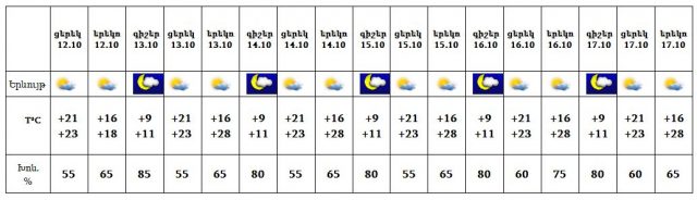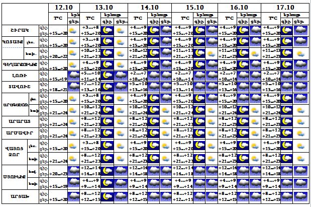 Հոկտեմբերի 12-ի ցերեկը, 13-ին՝ Լոռիում, Տավուշում, Սյունիքում և Արցախում սպասվում է թույլ անձրև, 14-17-ը՝ առանձին շրջաններում: