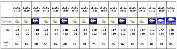 Հոկտեմբերի 16-ի ցերեկը, 16-20-ը սպասվում է առանց տեղումների եղանակ, հոկտեմբերի 21-ի երեկոյան ժամերին հնարավոր է անձրև։