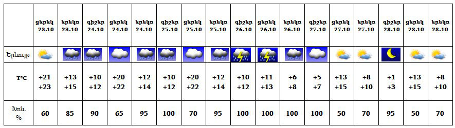 Հոկտեմբերի 23-ի ցերեկը սպասվում է փոփոխական ամպամածություն, քաղաքի առանձին հատվածներում հնարավոր է կարճատև և թույլ անձրև։ Հոկտեմբերի 24-25-ը հատկապես կեսօրից հետո սպասվում է կարճատև անձրև: Հոկտեմբերի 26-ին ժամանակ առ ժամանակ սպասվում է անձրև և ամպրոպ, ամպրոպի ժամանակ սպասվում է քամու ուժգնացում` 15-20 մ/վ։ Հոկտեմբերի 27-28-ը սպասվում է առանց տեղումների եղանակ։