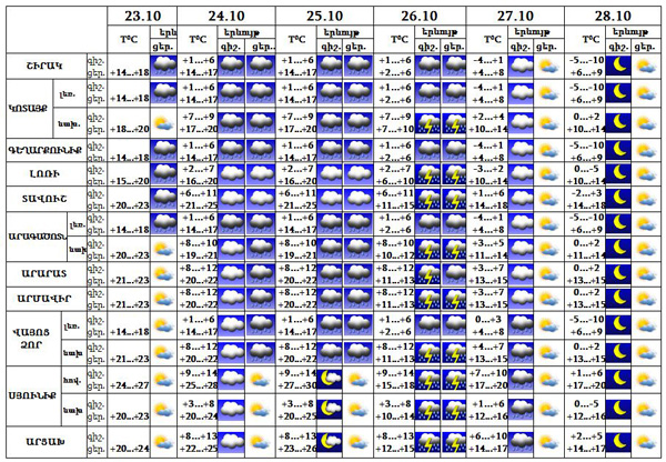 Հոկտեմբերի 23-ի ցերեկը հյուսիսային շրջաններում, 24-25-ը շրջանների զգալի մասում, 26-ին ժամանակ առ ժամանակ բոլոր շրջաններում, 27-ի գիշերը Վայոց Ձորիում, Սյունիքում և Արցախում սպասվում է անձրև։ Հոկտեմբերի 27-ի ցերեկը, 28-ին սպասվում է առանց տեղումների եղանակ։