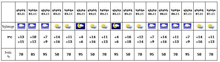 Նոյեմբերի 2-ի ցերեկը, 6-ին առանձին շրջաններում սպասվում են թույլ տեղումներ: Նոյեմբերի 3-5-ը, 7-ին սպասվում է առանց տեղումների եղանակ։