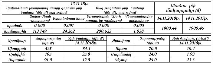 Նոյեմբերի 14-ի ցերեկը, 15-18-ը շրջանների զգալի մասում, 19-ի գիշերը Վայոց ձորում, Սյունիքում և Արցախում սպասվում են տեղումներ, 19-ի ցերեկը սպասվում է առանց տեղումների եղանակ: