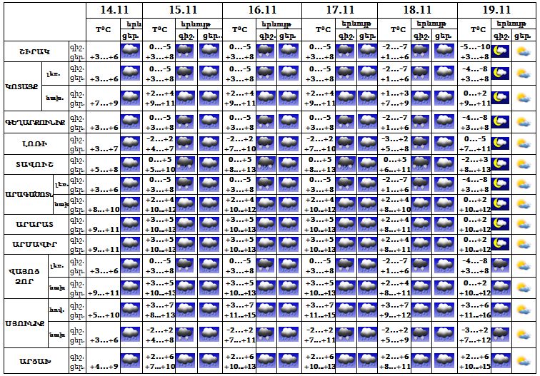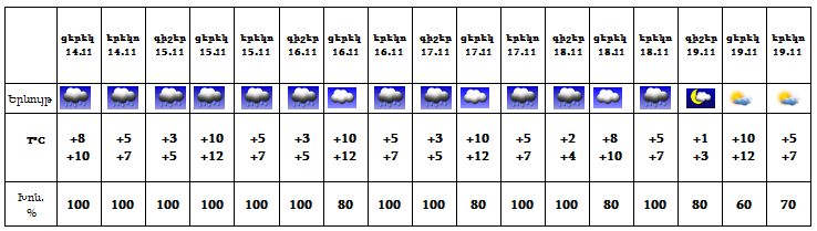 Նոյեմբերի 14-ի ցերեկը, 15-18-ը ժամանակ առ ժամանակ սպասվում է անձրև, 19-ին սպասվում է առանց տեղումների եղանակ: