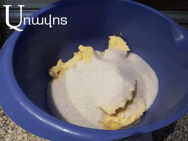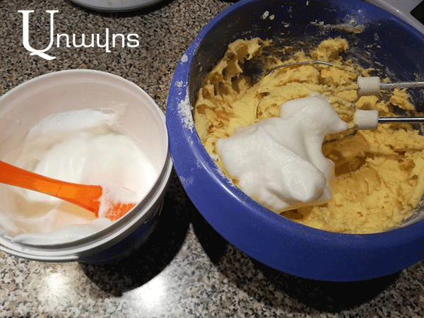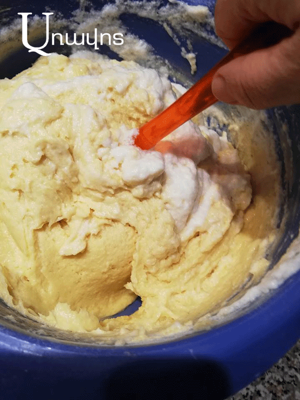 Սենյակային ջերմաստիճանի կարագին ավելացրեք շաքարավազը եւ լավ հարեք, որ դառնա կրեմի նման, ավելացրեք վանիլը՝ եթե փոշի է՝ մի պտղունց, եթե մզվածքն է՝ մի ճաշի գդալ, եթե վանիլային շաքար է՝ մի տուփ: Ավելացրեք նաեւ ռոմը, որը կարող եք փոխարինել նաեւ կոնյակով կամ որեւէ լիկյորով: Ապա ավելացրեք 3 ամբողջական ձու եւ 6 դեղնուց, լավ հարեք: Ավելացրեք ալյուրը, սոդան ու օսլան: Կարող եք վերցնել ինչպես կարտոֆիլի, այնպես էլ՝ եգիպտացորենի օսլա: Կդառնա բավականին պինդ խմոր: Մնացած վեց սպիտակուցն առանձին հարեք մի պտղունց աղի հետ: Ստացված բեզեն գդալ-գդալ ավելացրեք խմորին եւ արդեն ոչ թե էլեկտրական հարիչով, այլ՝ սիլիկոնե թիակով կամ փայտե գդալով խառնեք խմորին: