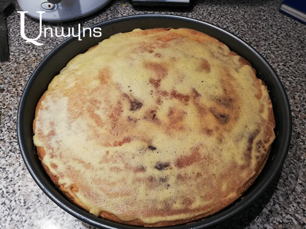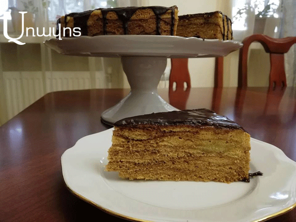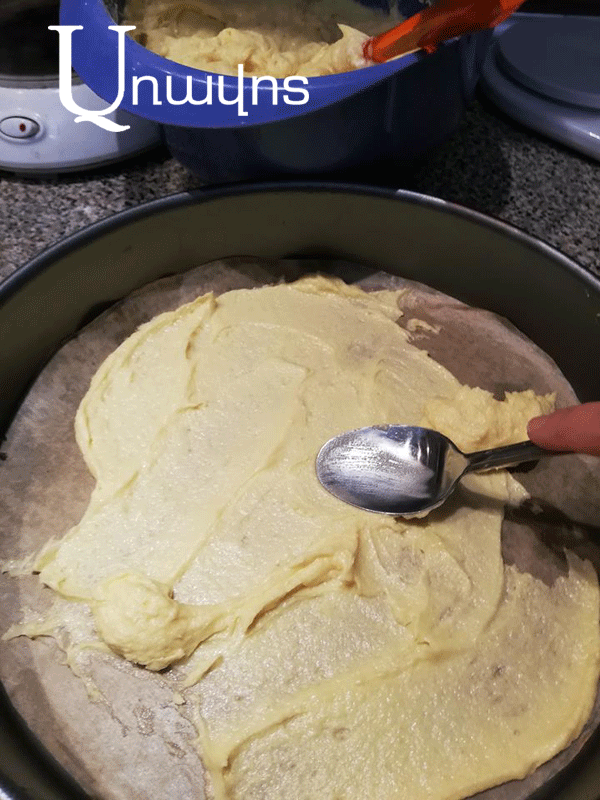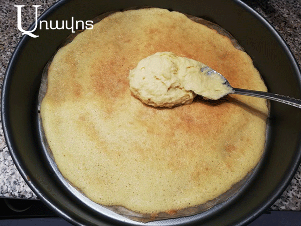 Թավայի հատակին յուղաթերթ փռեք՝ շրջանաձեւ կտրած: Խմորից երկու գդալ լցրեք թավայի մեջ եւ լավ տարածեք: Դրեք ջեռոցի ամենավերին հարկում: Կեփվի մոտավորապես 5 րոպեից, ուշադիր եղեք, նայեք, հենց գույնը փոխի, դառնա բաց շագանակագույն, հանեք, վրան քսեք եւս երկու գդալ խմոր, նորից դրեք ջեռոց՝ վերեւի հարկում: Եվ այդպես՝ մինչեւ ողջ խմորը եփեք: Քանի որ ջերմությունը միայն վերեւից է, ներքեւի հատվածը չի վառվի՝ մինչեւ բոլոր շերտերը եփվեն: Ինձ մոտ ստացվեց 18 շերտ: