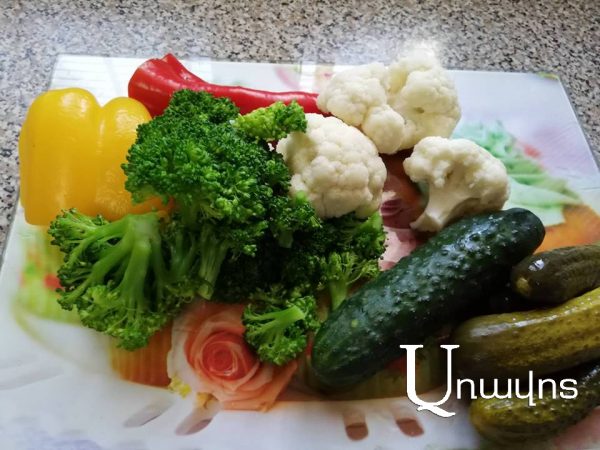 Բանջարեղենը կարող եք վերցնել ըստ ճաշակի՝ թե տեսակի, թե քանակի առումով: Կոնկրետ դեպքում ես վերցրել եմ մի քանի կտոր բրոկոլի, մի քանի կտոր ծաղկակաղամբ, մեկ վարունգ, կես կարմիր եւ կես դեղին թարմ պղպեղ, կես հատ կարմիր սոխ, թարմ կանաչիներ
