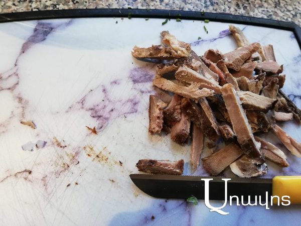 Միսը կարող է լինել ինչպես յուղոտ, այնպես էլ՝ ամբողջովին անյուղ կտոր: Կարեւորը՝ շատ ջլոտ չլինի: Կարող եք վերցնել թարմ միս, կարող եք վերցնել նախապես խաշած միս: Եթե թարմ է, երկար-բարակ կտրատեք, աղ, սեւ պղպեղ արեք, թողեք մոտ կես ժամ՝ սենյակային ջերմաստիճանում մնա, կամ ամբողջ գիշեր՝ սառնարանում: Եթե արդեն խաշած է կամ, ինչպես այս դեպքում է՝ ջեռոցում եփված, պարզապես կտրատեք երկար-բարակ կտորներով եւ դրեք մի կողմ: