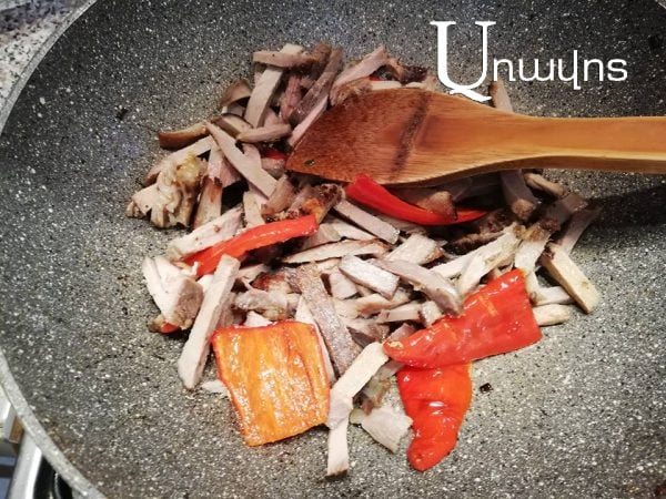 Հենց միսը բավարար չափով տապակվի, նույն թավայի մեջ ավելացրեք պղպեղները եւ սխտորը, թողեք դրանք էլ տապակվեն՝ պարբերաբար խառնելով: