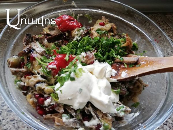 Տապակված միսն ու պղպեղները նույնպես լցրեք աղցանամանի մեջ: Ավելացրեք նաեւ մյուս մթերքները՝ նուռը, կտրատած ընկույզը, կտրատած կանաչին, համեմունքները եւ քամած մածունը: Լավ խառնեք, թողեք 10-15 րոպե՝ համերը միահյուսվեն եւ մատուցեք: