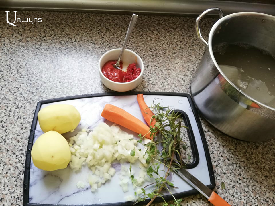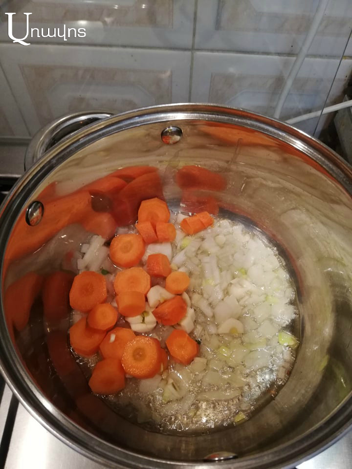 Մինչ ոսպը եփվում է, մաքրեք եւ լվացեք բոլոր բանջարեղենները՝ գազար, կարտոֆիլ, սոխ, սխտոր, կանաչիներ: Սոխն ու սխտորը մանր կտրատեք, իսկ գազարն ու կարտոֆիլը՝ մի քանի կտորի բաժանեք: