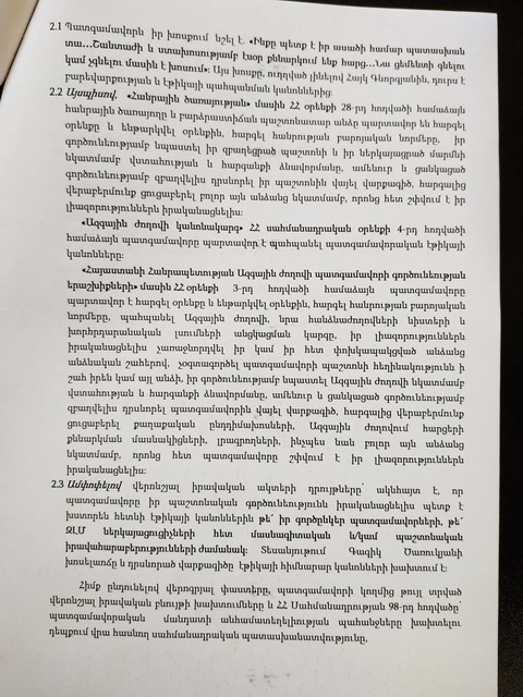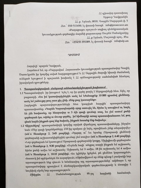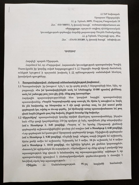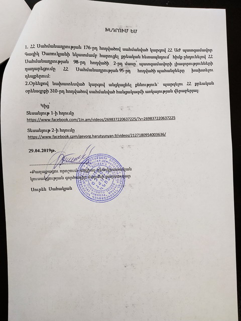 «Քաղաքացու որոշում» սոցիալ-դեմոկրատական կուսակցությունը՝ ի դեմս գործադիր մարմնի քարտուղար Սուրեն Սահակյանի, դիմում է ներկայացրել ԱԺ նախագահ Արարատ Միրզոյանին և ՀՀ Գլխավոր դատախազ Արթուր Դավթյանին՝ սույն թվականի ապրիլի 19-ին «Պետական տուրքի մասին ՀՀ օրենքում լրացումներ կատարելու մասին» օրենքի նախագծի քննարկման ժամանակ ԱԺ նիստերի դահլիճում և դրանից դուրս լրագրողների հետ շփումներում հնչեցրած հայտարարությունների հետ կապված քրեական հետապնդում հարուցելու և պատգամավորական մանդատից զրկելու գործընթաց սկսելու հարցով՝ հաշվի առնելով պատգամավորի ձեռնարկատիրական գործունեությամբ զբաղվելու արգելքը։