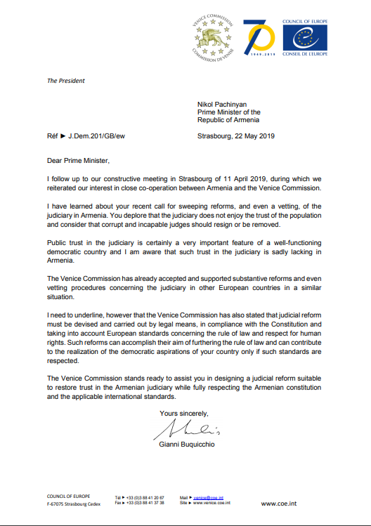 Վենետիկի Հանձնաժողովը պատրաստակամ է օժանդակելու Ձեզ՝ Հայաստանի դատական համակարգի նկատմամբ վստահության վերականգնման նպատակով իրականացվելիք բարեփոխումների մշակման հարցում՝ հարգելով Հայաստանի սահմանադրությունն ու համապատասխան միջազգային չափանիշները»,–նշված է նամակում: