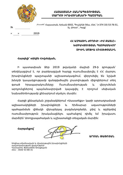 ՄԻՊ-ի պատասխանը չի ուշացել․ Արման Թաթոյանը գրություն է ուղարկել պատգամավորին, որտեղ նշված է, որ բարձրացված հարցը ուսումնասիրվել է ՀՀ մարդու իրավունքների պաշտպանի աշխատակազմում, վերլուծվել են նաև լրատվամիջոցներում տեղ գտած հրապարակումները։ Կայացվել է որոշում սեփական նախաձեռնությամբ քննարկում սկսելու մասին։
