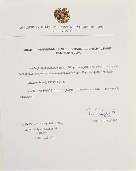Ինչ վերաբերում է Վահե Գրիգորյանի հայտարարությանն այն մասին, որ եթե որեւէ իրավիճակում ՍԴ նախագահ Հրայր Թովմասյանը հրաժարական տա, ապա ինքը պատրաստ է աշխատել որպես ՍԴ նախագահ, Արարատ Միրզոյանը նշեց. «Ո՞վ չէր ուզի, եթե լիներ Վահե Գրիգորյանի փոխարեն: Կարծում եմ՝ ոչ բոլորը կարող են ունենալ նույն պատրաստվածության աստիճանը, բայց բավականին գայթակղիչ է հնչում, համաձայն չե՞ք: Հստակ արձանագրենք՝ ես չասացի, թե ես ուզում եմ, որ Հրայր Թովմասյանը հրաժարական տա, Վահե Գրիգորյանն էլ նրան փոխարինի: Իշխանությունը չի կարող դիտարկել Հրայր Թովմասյանի հրաժարականը»:
