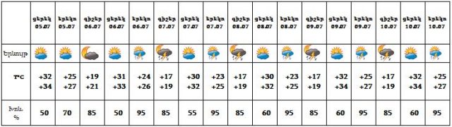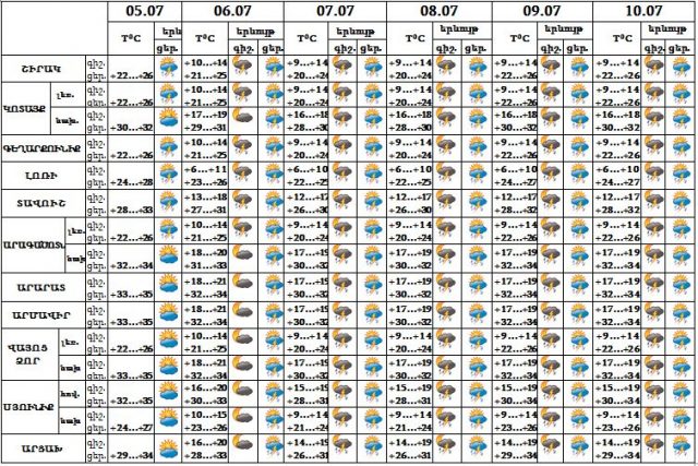 Հուլիսի 5-ի ցերեկը հյուսիսային շրջաններում, 6-10-ին՝ շրջանների զգալի մասում սպասվում է կարճատև անձրև և ամպրոպ, առանձին վայրերում հնարավոր է նաև կարկուտ: