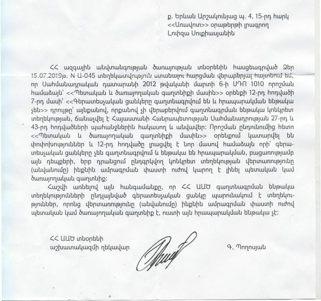 Ինչպես ավելի վաղ հայտնել էինք, «Իրազեկ քաղաքացիների միավորում» հ/կ-ն դատական հայց է ներկայացրել ՀՀ Ազգային անվտանգության ծառայության դեմ՝ Սահմանադրական դատարանի 2012թ.-ի համապատասխան որոշումը կատարելու պահանջով: Պատասխանող կողմը ոչ թե ԱԱԾ ղեկավար Արթուր Վանեցյանն է, այլ ԱԱԾ-ն: Հայցի առնչությամբ ԱԱԾ-ի դիրքորոշումն իմանալու նպատակով Aravot.am-ը դիմել էր ծառայությանը: Մեզ ուղղված ԱԱԾ պարզաբանումը` ստորեւ:
