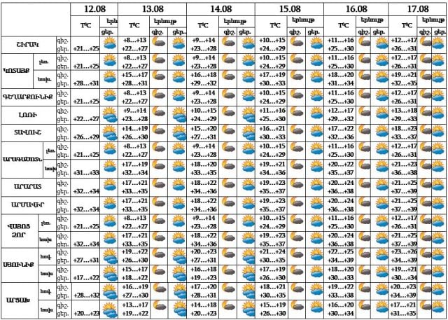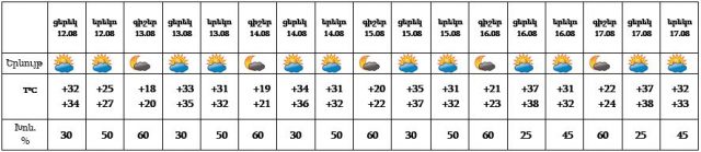 Օգոստոսի 12-ի ցերեկը, 13-17-ը սպասվում է առանց տեղումների եղանակ, երեկոյան ժամերին սպասվում է քամու ուժգնացում՝ 15-20 մ/վ։
