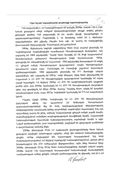 «2008թ. փետրվարի 19-ին ՀՀ նախագահի ընտրություններից հետո Երևան քաղաքում սկսվեցին դժգոհության ալիքներ, տեղի էին ունենում հանրահավաքներ, ցույցեր, որոնք անցկացվում էին Ազատության հրապարակում: Այդ նույն ժամանակահատվածում, իմ հիշելով, Ադրբեջանի Հանրապետությունում, շփման գծում իրականացվում էին ԶՈւ ուժեղացված միջոցառումներ, որին մենք հետևում էինք: 2008թ․ փետրվարի 25-ից 26-ից հետո հանրահավաքները սկսեցին անկում ապրել: 2008թ․ մարտի 1-ին Ազատության հրապարակում հանրահավաքի մասնակիցներին ոստիկանության ուժերը ցրեցին, ուժային գործողություններ են կիրառել, որն իմ և իմ կոլեգաների մոտ զարմանք առաջացրեց, քանի որ ցուցարարները քիչ էին, խաղաղ հանրահավաք, նստացույց էին անում, – գրել է Արշակ Կարապետյանը. -Դրանից հետո, ինչքան հիշում եմ, բազմահազար մարդիկ սկսեցին կուտակվել Մյասնիկյանի արձանի մոտ: Իմ կարծիքով, ուժային միջոցառումները գրգռեցին մարդկանց, ստիպեցին բազմահազարանոց կուտակումներով հավաքվել: Այդ օրը նաև բախումներ եղան ժողովրդի և ոստիկանների միջև: Այդ օրերի ընթացքում, ինչպես նշեցի, ադրբեջանական զինված ուժերը քիչ-քիչ կուտակվում էին սահմանային տարբեր հատվածներում, հատկապես Արցախի պաշտպանության շրջաններում: Հետևանքը եղավ այն, որ առ ժամանակ անց հակառակորդի դիվերսիոն խումբը գրավեց պաշտպանական մի հենակետ: Իհարկե, մեր զինված ուժերը կարճ ժամանակ անց հետ գրավեցին մարտական հենակետը՝ հակառակորդին պատճառելով զգալի կորուստներ՝ մի քանի զոհ էին տվել, դիակները թողել էին մեր հենակետում»։