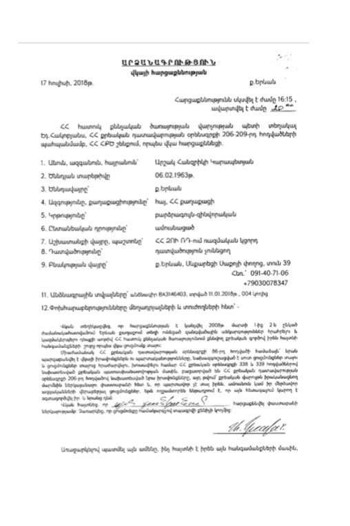 «Առաջին լրատվական»-ը հրապարակել է Մարտի 1-ի քրեական գործի շրջանակներում 2008 թվականին Երևանի կայազորի պետ, այժմ ՀՀ վարչապետ Նիկոլ Փաշինյանի խորհրդական Արշակ Կարապետյանի նախաքննական ցուցմունքը: