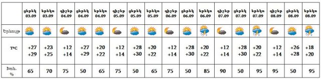 Սեպտեմբերի 3-ի ցերեկը, 4-5-ը սպասվում է առանց տեղումների եղանակ, 6-8-ը քաղաքի առանձին հատվածներում հնարավոր է կարճատև անձրև և ամպրոպ, ամպրոպի ժամանակ հնարավոր է քամու ուժգնացում՝ 15-20 մ/վ: