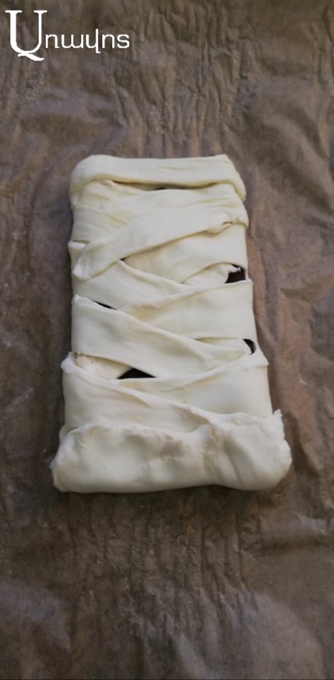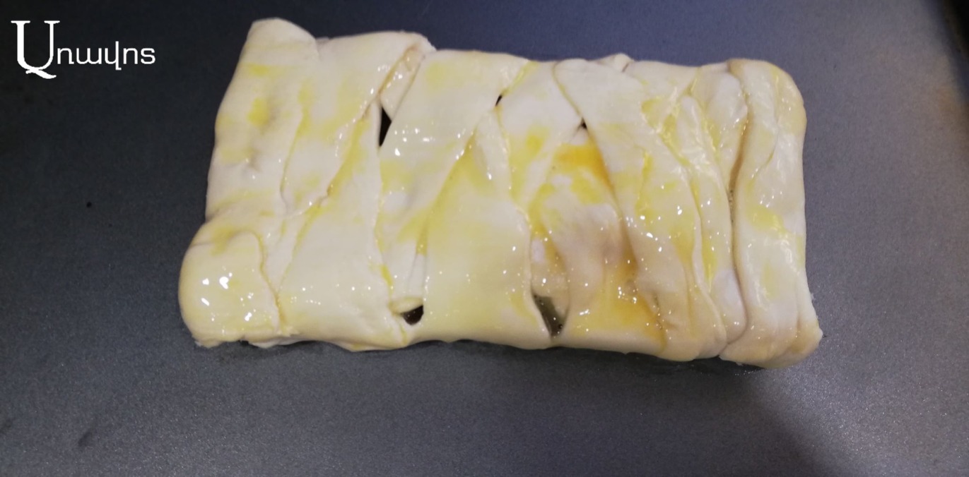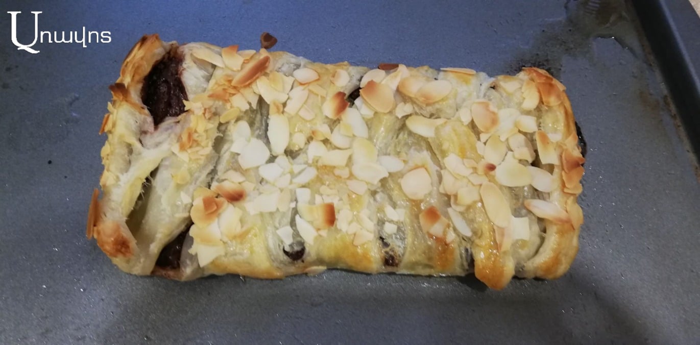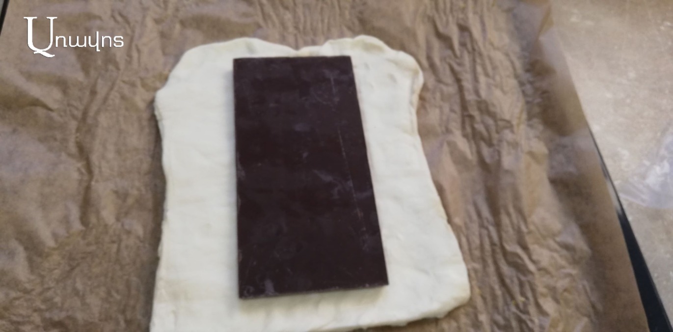 Շերտավոր խմորը գրտնակեք, որպեսզի ստացվի ուղղանկյուն շերտ, որն իր մակերեսով մեծ է շոկոլադի սալիկից: Շոկոլադի սալիկը դրեք կենտրոնում: Խմորի՝ դուրս մնացած մասերը կտրեք լուսանկարում ցուցադրված ձեւով: Վերեւի եւ ներքեւի շերտերը ծալեք ներս, իսկ կողքի շերտերով «հյուսեք» շոկոլադի սալիկը: