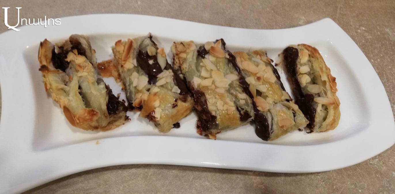 Ավելի հեշտ եւ արագ պատրաստվող թխվածք դժվար է պատկերացնել: Այնքան արագ եւ այնքան քիչ ջանքեր պահանջող, բայց միեւնույն ժամանակ այնքան համեղ թխվածք է, որ կդառնա ձեր խոհանոցի մշտական հյուրը: Անհրաժեշտ է ընդամենը երեք բաղադրիչ՝ շերտավոր խմոր, շոկոլադ եւ ձու: Ընդհանրապես, խորհուրդ եմ տալիս սառցարանում մշտապես ունենալ 1-2 գունդ շերտավոր խմոր՝ հրատապ դեպքերի համար: Պետք եղած ժամանակ 2 ժամ առաջ կարող եք հանել սառցախցիկից եւ պատրաստել այս խմորեղենը: