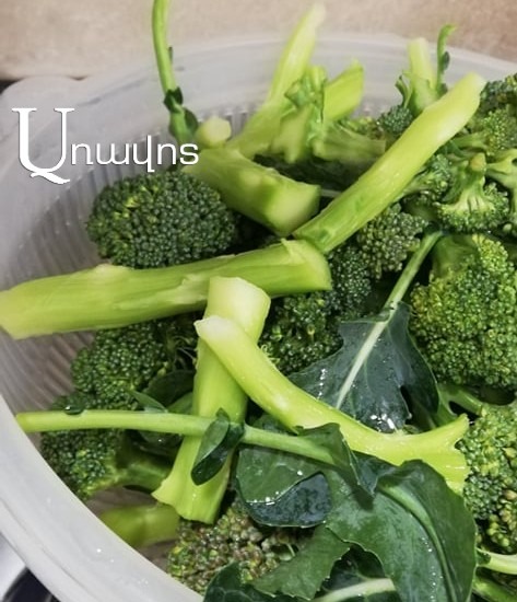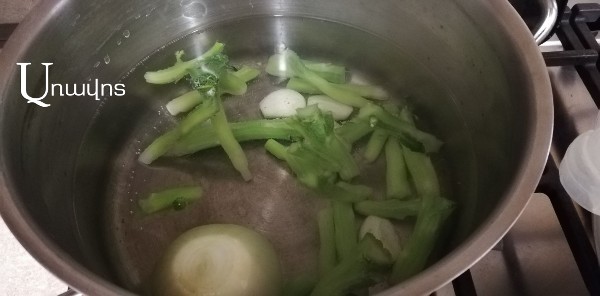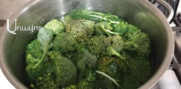 Կաթսայի մեջ 0,5-0,8 լ ջուր լցրեք, դրեք թող եռա, ավելացրեք երկու- երեք մասի բաժանած սոխը, սխտորը, բրոկոլիի կեղեւահան ցողունները:
