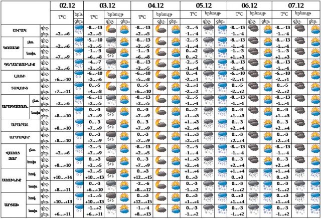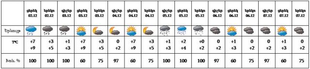 Դեկտեմբերի 2-ի ցերեկը, 3-ի գիշերը, 5-ին շրջանների մեծ մասում, 6-7-ը Սյունիքում և Արցախում սպասվում են տեղումներ, լեռնային և նախալեռնային շրջաններում՝ ձյան տեսքով: Դեկտեմբերի 3-ի ցերեկը, 4-ին սպասվում է առանց տեղումների եղանակ: