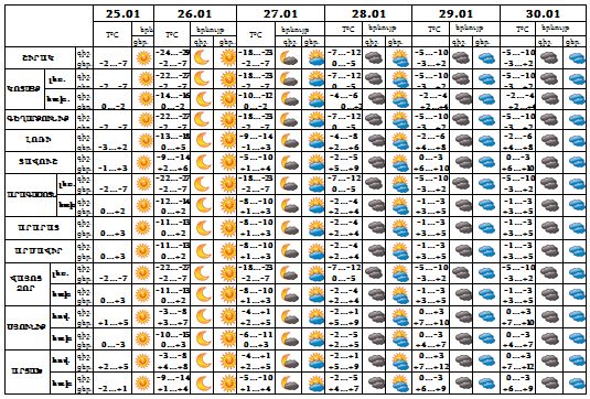 Հունվարի 25-ի ցերեկը, 26-30-ը սպասվում է առանց տեղումների եղանակ։