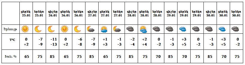 Հունվարի 25-ի ցերեկը, 26-30-ը սպասվում է առանց տեղումների եղանակ։