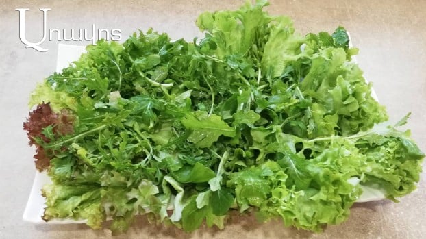 Հազարաթերթիկը եւ ռուկոլան լավ լվանալ ու շատ լավ չորացնել: Խոշոր կտրատել, շարել մատուցարանի մեջ: