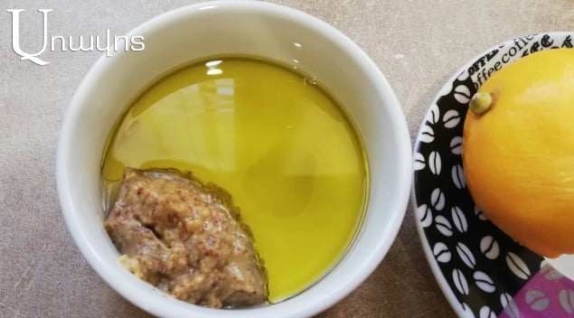 Առանձին փոքրիկ խորը ամանի մեջ իրար խառնել մանանեխը, կիտրոնի հյութն ու ձիթապտղի յուղը: Կարող եք այս բոլորը լցնել ապակյա բանկայի մեջ, կափարիչով փակել եւ լավ թափահարել: