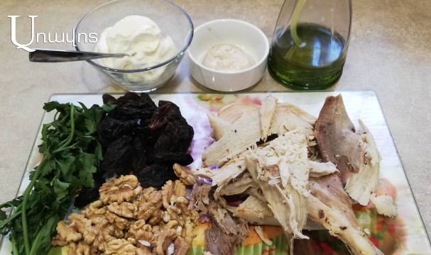 Խնձորները լավ լվացեք, կտրատեք ծղոտաձեւ: Սալորաչիրը նույնպես կտրատեք ծղոտաձեւ, իհարկե, նախապես հանելով կորիզները՝ եթե կորիզահան չէին: Կանաչին լավ լվացեք, շատ լավ չորացրեք, մանրացրեք: Հնդկահավի կամ հավի պատրաստի կտորները (ջեռոցում պատրաստված, խաշած կամ տապակած, կամ նույնիսկ՝ ապխտած) մանրացրեք՝ նույնպես ծղոտաձեւ: Կտրատեք նաեւ ընկույզը: