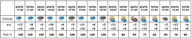 Մարտի 17-ի ցերեկը, 18-19-ը, 20-ի գիշերը սպասվում են տեղումներ, 20-ի ցերեկը, 21-22-ը սպասվում է առանց տեղումների եղանակ։