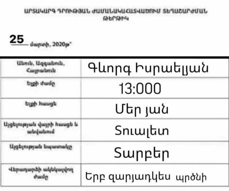 Ինչպես հայտնի է՝ ՀՀ պարետի որոշմամբ, արտակարգ դրության պայմաններում, մարտի 26-ից ՀՀ քաղաքացիների տեղաշարժը սահմանափակվում է: Նրանք կարող են տնից դուրս գալ միայն կենսական անհրաժեշտության դեպքում, եւ այդ պարագայում էլ անպայման ունենան անձնագիր եւ լրացված ձեւաթուղթ: