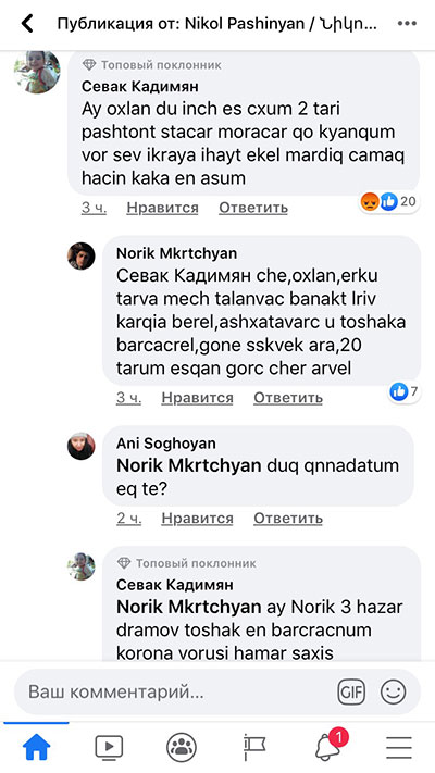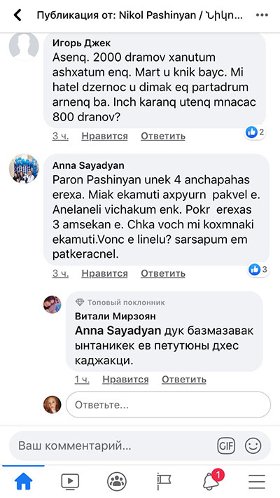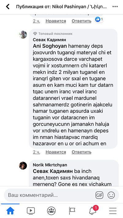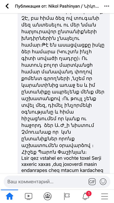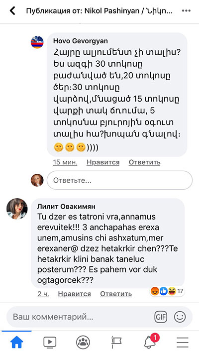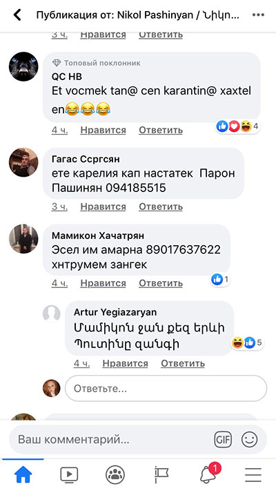 Ուշագրավ է, որ բավականին շատ են ռուսերեն կամ ռուսատառ հայերեն մեկնաբանությունները: Մի օգտատեր գրել է՝ «ете карелия кап настатек парон Пашинян» ու թողել համարը, Մամիկոն Խաչատրյան անունով մի օգտատեր էլ ռուսատառ հավելել, թե՝ սա էլ իմ համարն է, խնդրում եմ զանգեք: Օգտատերերը հումորներ են անում, թե՝ «Մամիկոն ջան, քեզ երեւի Պուտինը զանգի»: