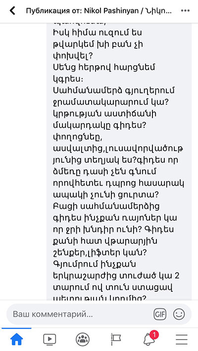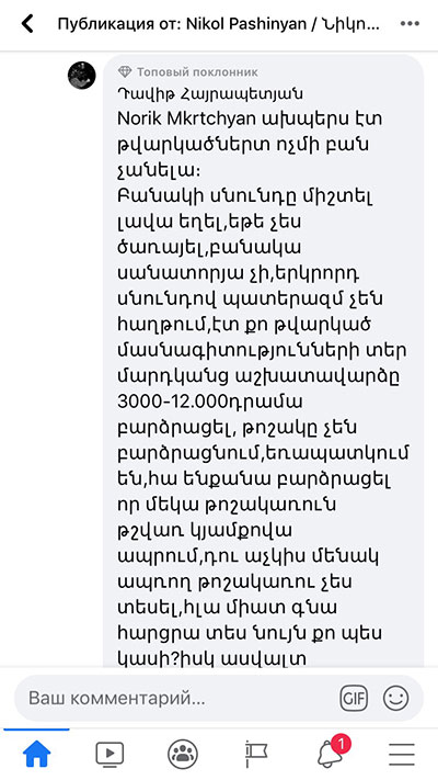 Օգտատերերից մեկը՝ Դավիթ Հայրապետյանը գրում է. «Բանակի սնունդը միշտ էլ լավ է եղել, բանակը սանատորիա չի: Երրորդ՝ սնունդով պատերազմ չեն հաղթում…թոշակն էնքան են բարձրացնում, որ թոշակառուն, մեկ է, թշվառ կյանքով է ապրում: Սահմանամերձ գյուղերում ջրամատակարարում կա՞: Կրթության աստիճանի մակարդակը գիտե՞ս: Փողոցների ասֆալտից, լուսավորվածությունից տեղյա՞կ ես: Գիտե՞ս, որ ձմռանը դասի չեն գնում, որովհետեւ դպրոցը հասարակ ապակի չունի, ցուրտ է: Բացի սահմանամերձից, գիտե՞ս ինչքան ռայոններ կան, որ ջրի խնդիր ունեն, գիտե՞ս քանի հատ վթարային շենքեր,վերելակներ կան, Գյումրիում ինչքան երկրաշարժից տուժած կա ու 2 տարում ով տուն ստացավ պետության կողմից»: Այս խնդիրներին զուգահեռ նա հրապարակել է, թե ինչքան փող է ծախսում, Փաշինյանի աշխատակազմը, ԱԺ-ն, նախագահի աշխատակազմը, ՊԵԿ-ը, Երեւանի քաղաքապետարանը, նախարարություններն ու պետական այլ մարմինները»: