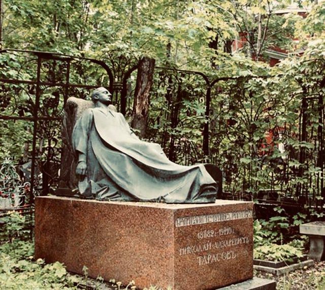 Տարասովի գերեզմանաքանդակի դեմքը կերտված է ետմահու հանված դիմակի ճշգրտությամբ: Մեծ Հայրենականի ժամանակ բրոնզյա այդ հուշաքարը հանում և ուղարկում են ձուլման: Զինամթերք էր հարկավոր: Այսօրվա տարբերակը հնի կրկնօրինակն է, որը կերտել է տաղանդավոր և աշխարհահռչակ Յուրի Օրեխովը: Այն տեղադրվել է 90-ական թվականներին: Օրիգինալ հուշաքանդակի գլուխը փրկվել է թատերական գործիչների ջանքերով և պահպանվում է Չեխովի անվան Մոսկվայի ակադեմիական թատրոնի թանգարանում: