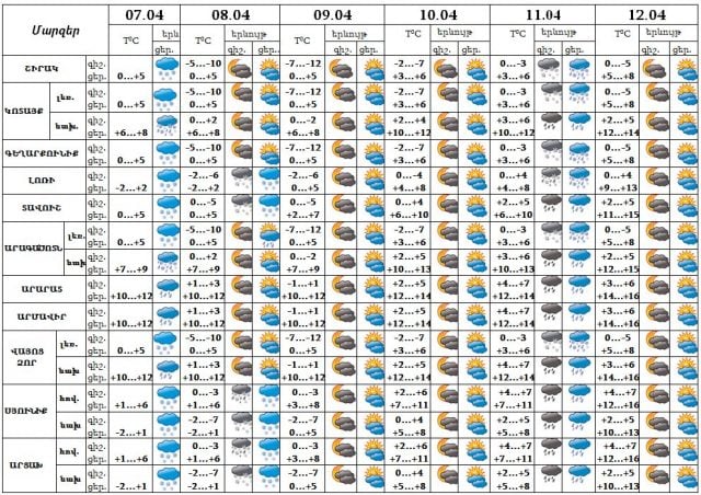 Ապրիլի 7-ի ցերեկը, 11-ին ժամանակ առ ժամանակ սպասվում է անձրև։ Ապրիլի 8-10-ը, 12-ին սպասվում է առանց տեղումների եղանակ։