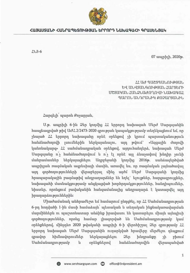 ՀՀ երրորդ նախագահի գրասենյակի կողմից այսօր պաշտոնական գրություն է ուղարկվել ՀՀ ԱԺ պաշտպանության և անվտանգության հարցերի մշտական հանձնաժողովի նախագահ Անդրանիկ Քոչարյանին` ի պատասխան ս.թ. ապրիլի 6-ին նրա կողմից ՀՀ երրորդ նախագահ Սերժ Սարգսյանին հղված գրության: