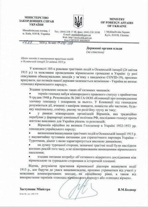 -Իմ տեղեկություններով՝ այսպիսի նամակներ ուղարկվել են նաև նախկինում, այն ուղերձով, որ ուկրաինացի պետական պաշտոնյաները մասնակցություն չունենան այն միջոցառումներին, որոնք կապված են Հայոց ցեղասպանության հիշատակի հարգման հետ: Ես հույս ունեմ, որ ժամանակակից աշխարհում, երբ Ուկրաինայում փոփոխություններ են տեղի ունեցել, երբ իշխանություն է փոխվել, փոխվել են առաջնահերթությունները, սա կհամարվի սխալմամբ տեղի ունեցած մի պատմություն, որն անպայման կուղղվի: