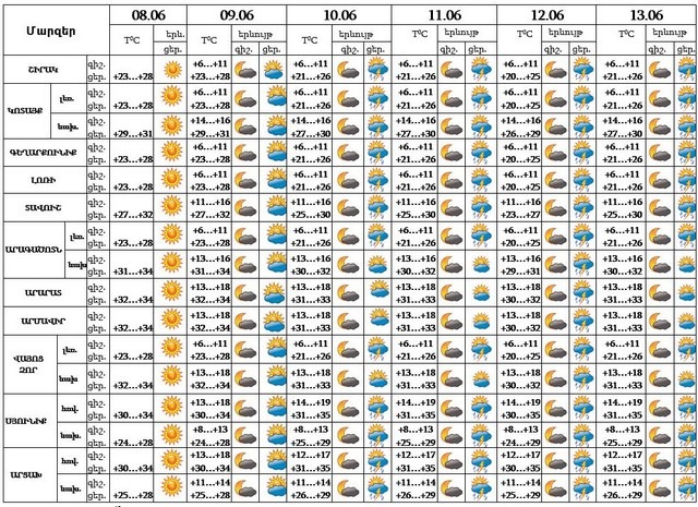 Հունիսի 8-ի ցերեկը, 9-ին սպասվում է առանց տեղումների եղանակ: Հունիսի 10-13-ը շրջանների զգալի մասում կեսօրից հետո սպասվում է կարճատև անձրև և ամպրոպ, ամպրոպի ժամանակ` քամու ուժգնացում՝ 15-20 մ/վ: