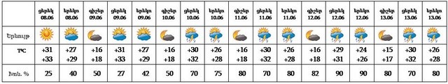 Հունիսի 8-ի ցերեկը, 9-ին սպասվում է առանց տեղումների եղանակ: Հունիսի 10-11-ը, 13-ի կեսօրից հետո քաղաքի առանձին հատվածներում հնարավոր է, 12-ին սպասվում է կարճատև անձրև և ամպրոպ, ամպրոպի ժամանակ հնարավոր է քամու ուժգնացում՝ 15-17 մ/վ: