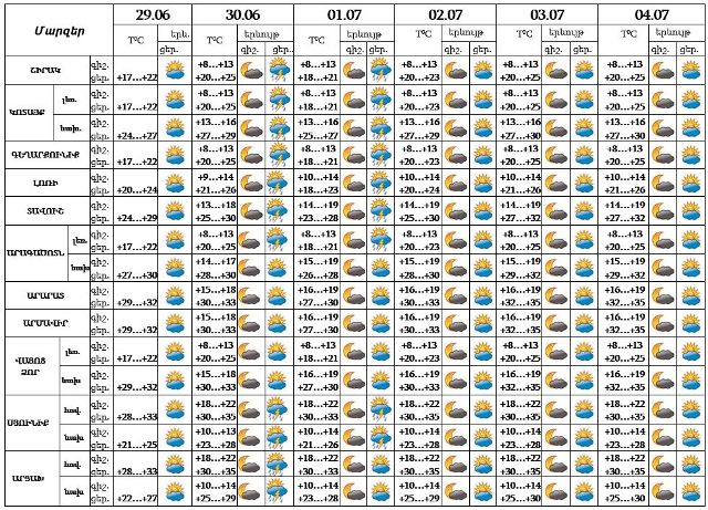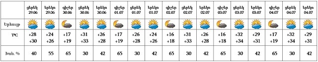 Հունիսի 29-ի ցերեկը, հուլիսի 2-4-ը սպասվում է առանց տեղումների եղանակ: Հունիսի 30-ի և հուլիսի 1-ի ցերեկն առանձին շրջաններում սպասվում է կարճատև անձրև և ամպրոպ, ամպրոպի ժամանակ` քամու ուժգնացում՝ 16-21 մ/վ: Առանձին վայրերում հնարավոր է նաև կարկուտ: