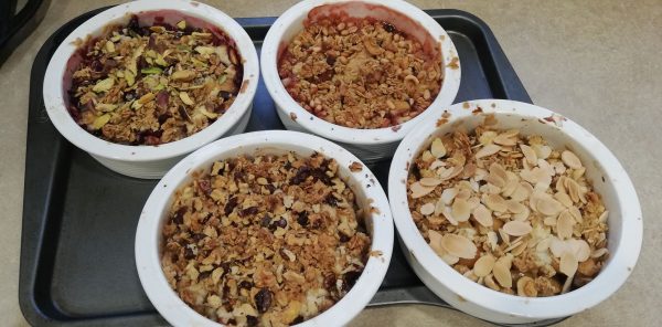 Եթե է՛լ ավելի յուրահատուկ բան եք ուզում ստանալ, մյուսլիի վրայից էլ որեւէ ընկուզեղեն ավելացրեք: Այս անգամ, օրինակ, բալով քրամբլի վրա մանր կտրատած պիստակ եմ ավելացրել, խնձորով քրամբլի վրա՝ մանրած ընկույզ, կեռասով քրամբլի վրա՝ նուշի փաթիլներ, իսկ սալորով քրամբլի վրա՝ մանրացրած կաղին (պնդուկ):