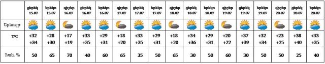 Հուլիսի 15-ի ցերեկը, 16-18-ն առանձին շրջաններում կեսօրից հետո սպասվում է կարճատև անձրև և ամպրոպ, ամպրոպի ժամանակ` քամու ուժգնացում՝ 20-25 մ/վ: Առանձին վայրերում սպասվում է նաև կարկուտ: