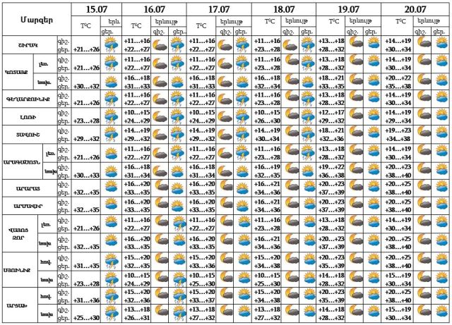 Հուլիսի 19-20-ն Արարատի և Արմավիրի մարզերում, Արագածոտնի նախալեռներում, Սյունիքի հովիտներում և Երևանում սպասվում է անոմալ բարձր ջերմային ֆոն, ցերեկային ժամերին օդի ջերմաստիճանը կհասնի +38․․․+40 աստիճանի։ Նշված օրերին հանրապետության հովտային և նախալեռնային գոտիներում սպասվում է նաև բարձր կարգի հրդեհավտանգ իրավիճակ։